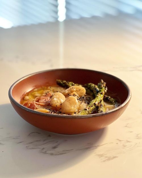the beans are cooked when they hold there shape, but are creamy and soft when you bite into them. meanwhile, over a medium heat char some asparagus and a little oil, and a pinch of salt.