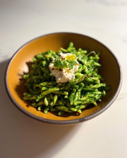 serve in your favorite bowl with more burrata, a sprinkle of red pepper flakes, more micro arugula, flaky salt and a good glug of extra virgin olive oil!a vividly verdant and peppery pasta indeed!