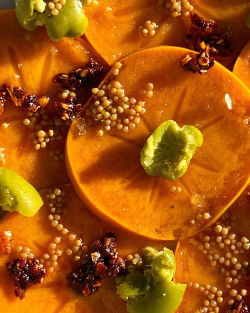 simply slice the persimmon thinly and dress with some castelvetrano, pickled mustard seeds (i pickled mine with some celery vinegar, but store bought works great), chilli crisp, vin, extra virgin olive oil and flaky salt. serve with some crusty baguette if you would like.
