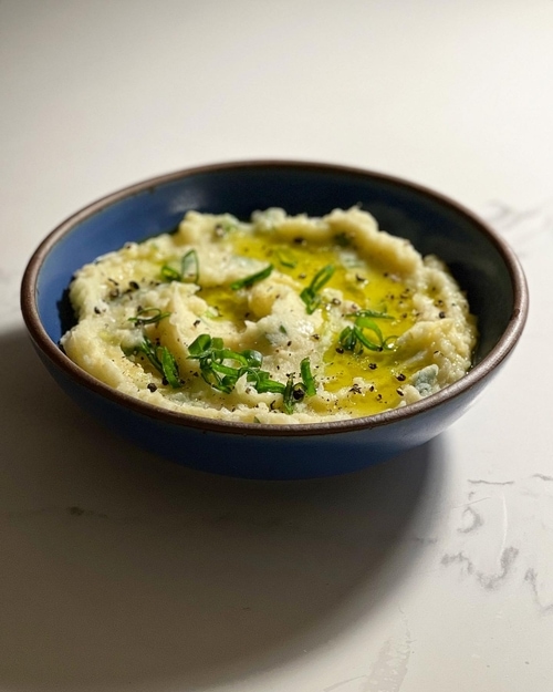 transfer everything to your favorite serving bowl, dress the potato with more finely chopped scallions, another glug of evoo, flaky sea salt and black pep on the big grind.