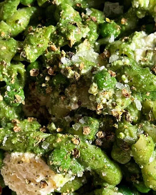 serve in your favourite pasta bowl, with a generous dollop of ricotta, flaky sea salt + and a few big cracks of green peppercorns on the big grind.