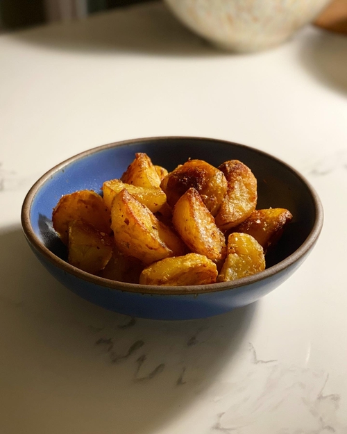 when the oil is hot, take out the pan and gently put the potatoes in, flip them a couple of times so they're covered in oil on all sides.